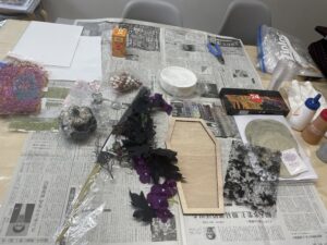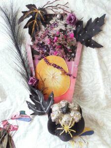事前に今回は「ハロウィンです」とお伝えはしておりましたが、まさか棺桶だとは思わなっかようで、びっくりされていました。パーツに黒い物が多いですが、きちんと黒パーツが生えるようにデザインされて、上手にまとまってハロウィンらしく素敵に仕上がっています。